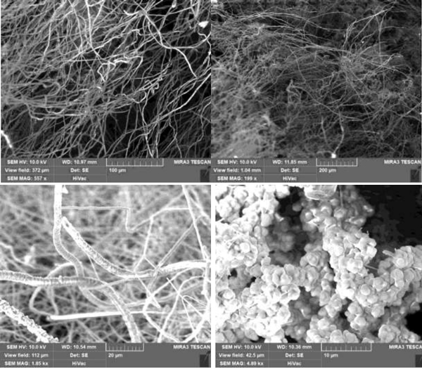 圖4:在圖中描述的不同放大倍數下獲取的碳化硅纖維的SEM圖像,下面部分的碳化硅成核生長點簇。