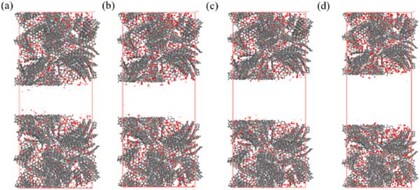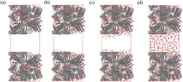 活性炭由微孔和介孔組成,介孔在一定程度上影響吸附特性。因此,研究芳烴在具有分級孔的活性炭上的吸附特性,以明確介孔對下一節(jié)吸附特性的影響。在這些模擬中,選擇了密度為0.8g/cm3的微孔活性炭,不同樣品的中孔尺寸分別選擇為2.0、2.5、3.0和4.0nm。具有不同層次孔隙的活性炭。分層孔隙活性炭模型構(gòu)建為密度在0.6-0.7g/cm3的合理范圍內(nèi)。圖3展示了苯分子在p=10kPa下具有不同中尺度孔徑的活性炭上的吸附位點分布。這表明即使在p=10kPa時,苯的吸附也僅發(fā)生在介孔表面,而不會填充介孔的空隙空間。圖4說明了對二甲苯在具有3.0nm孔的活性炭上從低壓到高壓的吸附位點的變化。從圖4(a)-(d)可以看出,只有微量的對二甲苯分子被吸附到微孔上,當壓力為1.25kPa時,微孔逐漸被填滿,中孔壁上出現(xiàn)吸附位點。當壓力增加到3.75kPa時,吸附位點增加,介孔中開始出現(xiàn)多層吸附,最終介孔充滿對二甲苯,此時壓力可達6.25kPa。