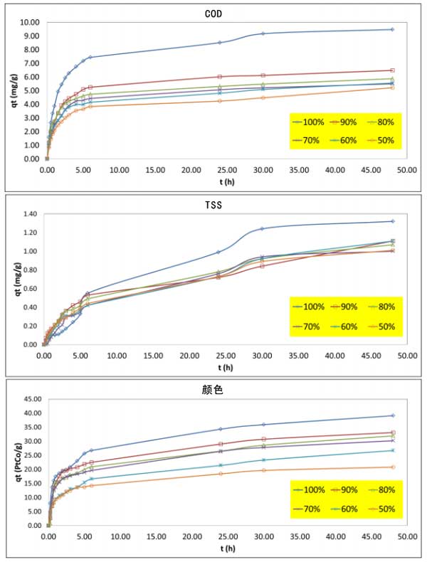 在不同溫度下,棕櫚油廢水濃度如圖2所示。所有初始濃度下的COD、TSS和顏色均顯示出隨接觸時間增加的吸附吸收。在早期,吸收迅速增加,表明有大量活性位點可用。然后,在達到平衡時,它最終顯示出飽和曲線,這可能是由于吸附劑表面的單層污染物覆蓋。在所研究的操作條件下,吸附吸收或活性炭吸附的污染物量在30小時的平衡時間(圖2)達到最大值。當廢水濃度從50%增加到100%時,顏色也會發(fā)生變化。然而,隨著廢水濃度的增加,COD、TSS和色度去除率降低。這一現象表明,除了由于活性炭吸附大量污染物的能力有限外,由于活性炭上用于處理濃縮棕櫚油廢水的活性位點堵塞,污染物的吸附量減少。
