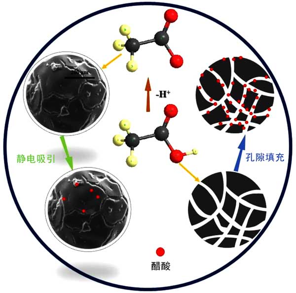活性炭對乙酸的吸附機理如圖3所示。結合上述吸附實驗和表征結果,吸附過程可能包括多個方面。首先,活性炭在足夠多的孔隙中可以發生孔隙填充效應,從而有效地吸附乙酸。其次,活性炭和乙酸之間存在靜電引力。在較高pH的溶液中,活性炭表面具有更多的負電荷,導致CH3COO-與活性炭表面之間的靜電排斥更強。
