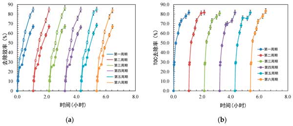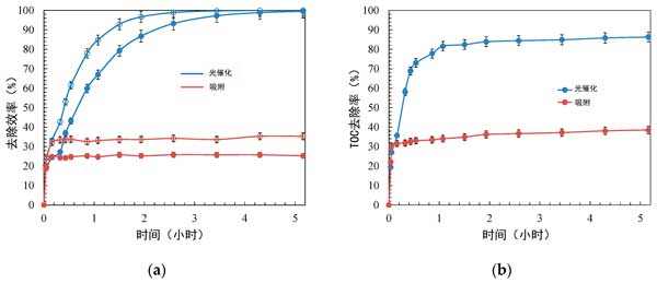 圖3:活性炭催化劑的吸附和光催化過程的去除效率。(a)初級(jí)降解,(b)礦化。