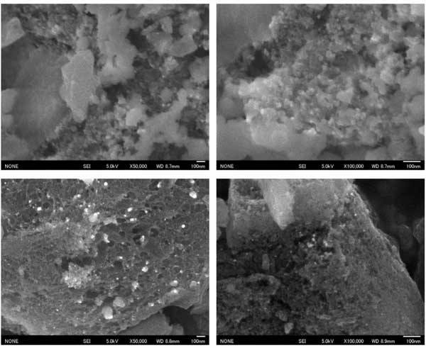 使用掃描電鏡在不同放大倍數(shù)下觀察氧化前(活性炭1)和氧化后(活性炭2)的表面形貌。根據(jù)SEM顯微照片在圖2,兩者的活性炭具有不同的形狀和孔的尺寸高度異質的表面。