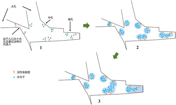 不同碳化溫度制備的活性炭1、2具有相似的吸附形狀,水的吸附形狀、吸收和滯后受表面官能團、孔徑、孔體積和孔連通性的強烈影響。為了解釋這一點,圖3說明了活性炭吸附水的理論機制。并非所有官能團對水分子都具有相同的親和力。但是羧基可以有很好吸引水分子。這次制造的活性炭具有羧基官能團,然后理論上作為水附著在活性炭表面的初始位點(圖3-1)。隨著更多的水被吸附,水-水開始通過氫鍵相互作用,然后形成簇(圖3-2)。如果每個官能團之間的距離足夠近,在合適的孔徑和大量或可接近的活性官能團,每個相鄰的水團可以合并并填充微孔(圖3-3)。活性炭的這種吸附能力的提高主要是由于在溫和條件下經過空氣處理后含氧表面官能團的增加和活性炭的孔隙發(fā)展引起的。