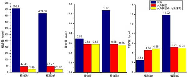 磷含量在兩個(gè)兩種植物油中主要由以所示的處理(水重量2%+活性炭0.1克)后減少圖2。植物油1的磷含量降低了大約95.22%,而植物油2的磷含量降低了大約相同的值(94.98%)。油液經(jīng)水脫膠后Mg、Ca含量略有下降,而Ca處理后略有升高。這一結(jié)果可能是由于在處理過程中活性炭中存在一些Ca解離回油相。活性炭對(duì)磷含量的大量降低是由于NaOH改性的活性炭具有極性、帶正電荷的表面。由于存在芳環(huán)簇和固有缺陷,它還具有磁力。在脫膠過程中將活性炭添加到植物油和水中時(shí),活性炭的芳環(huán)簇中的離域電子產(chǎn)生磁矩,強(qiáng)烈誘導(dǎo)磷脂磷酸頭部周圍的順磁性氧。同時(shí),活性炭的極性/親水性也允許與極性水分子相互作用。水分子也被磁場(chǎng)激活,從而發(fā)生氫自旋從旁水到鄰水的重新定向,從而降低水的抗磁性。活性炭誘導(dǎo)的這種磁場(chǎng)會(huì)導(dǎo)致表面張力降低,削弱水分子的分子內(nèi)能。結(jié)果,更多的水分子被分解成H+離子和OH-離子,促進(jìn)更多水解反應(yīng)。這些現(xiàn)象與其他力量相結(jié)合:熱能和離心也會(huì)引發(fā)磷脂分子內(nèi)的鍵斷裂,導(dǎo)致磷酸頭部基團(tuán)從磷脂分子上分離(脫磷脂)。