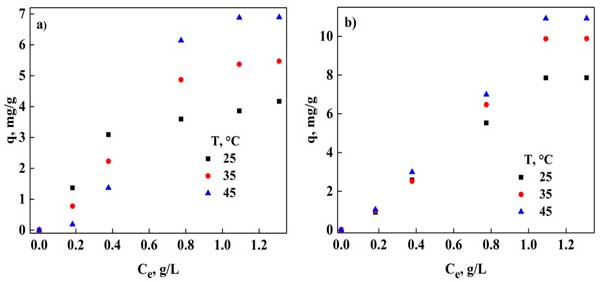 平衡吸附分析使我們能夠獲得不同等溫線模型的參數,表明在去除污染物時進行了何種類型的過程。在圖1中,顯示了使用粉末活性炭(圖1a)和活性炭(圖1b)在不同溫度下DNS的吸附能力。還觀察到3,5-二硝基水楊酸在兩種吸附劑中的吸附都隨著溫度的升高而顯著影響,隨著溫度的升高呈現出更大的吸附。因此,在45℃時,活性炭和粉末活性炭的大吸附容量分別為6.97和11.57mg/g。這可能是由于去除過程的環境,這會導致吸附劑表面隨著溫度的升高而增加其對3,5-二硝基水楊酸吸附的參與。使用商用活性炭的文獻中也報道了類似的行為。在其他研究中,使用這種吸附劑還觀察到,基于苯酚、高氯酸鹽和重金屬等的不同化合物的吸附能力有所增加。