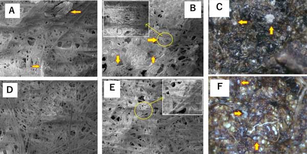 圖3:紙表面的顯微外觀(50倍放大),(A)在生物降解測試前帶有納米活性炭/纖維素紙;(BC)經生物降解試驗后的納米活性炭/纖維素紙;(D)纖維素紙僅在生物降解試驗之前;(EF)纖維素紙僅經過生物降解測試。黃色狹窄對應于來自土壤的真菌菌絲體,插入的圖像放大250倍。