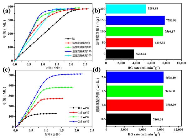 圖2:在鈷中添加了(a,b)量的活性炭,(c,d)硼氫化鈉濃度的所制備樣品的產(chǎn)氫率。