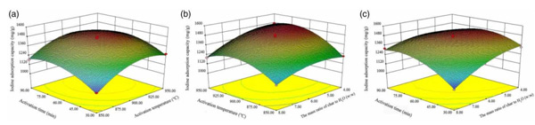 圖1:碘吸附能力的3D表面模型圖(a)活化時間和活化溫度,(b)炭與水的質量比和活化溫度,(c)炭與水的質量比和活化時間。