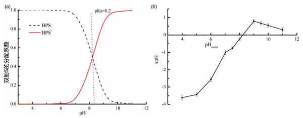 pH值是吸附過程中的另一個關鍵因素,它可能會影響水相中雙酚S的形式和活性炭的表面凈電荷。雙酚S的分布系數如圖3(a)所示,雙酚S的pKa為8.2。由于羥基在pH值下的去質子化,陰離子形式(雙酚S)的比例增加。當pH值為6時,陰離子形式(BPS)是主要的離子形式。雙酚S的零點電荷(pHpzc)是通過加鹽法測量的。如圖3(b)所示,活性炭的pHpzc約為8.23。這表明雙酚S在pH值為8.23時其表面帶有正電荷,而在pH值時其表面帶有負電荷。