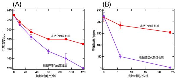 為了研究在此處使用的條件下K2CO3活化的活性炭是否可以完全去除甲苯,觀察甲苯濃度24小時。圖3b顯示了24小時觀察期間甲苯濃度與時間的關系。活性炭顯然能夠從空氣中吸附大量氣態甲苯。吸附24小時后的最終甲苯濃度非常低,僅檢測到痕量的甲苯。相比之下,當使用未活化的吸附劑時,即使在吸附24小時后,仍有相當數量的甲苯(160ppm)。