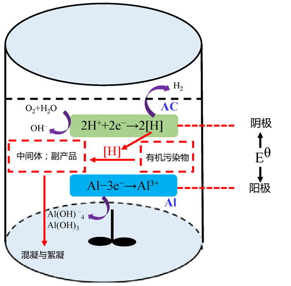 根據實際工況,提出了一種可行的活性炭載鋁微電解工藝分解水生環境中有機污染物的反應機理(圖2)。由于其高吸附容量和電導率,活性炭被用作陰極保護。在陽極(鋁廢料),由鋁提供的電子通過微型原電池轉移到陰極(活性炭),吸附在陰極表面的有機污染物受到這些釋放的電子的攻擊。水電離產生的H+在陰極獲得電子并產生具有強化學反應性的活性氫[H]或H2,和活性氫[H]·可以部分降解有機污染物。此外,Al失去三個電子形成鋁離子(Al3+)。然后,鋁離子沉淀形成氫氧化鋁(Al(OH)3、Al(OH)-4等)。作為有利的絮凝劑,這些氫氧化鋁可以有效去除廢水中的有機污染物。難降解污染物在活性炭載鋁微電解工藝的輔助下被分解為小分子中間體,也可以通過氫氧化鋁絮狀污泥的絮凝共沉淀來消除。換言之,與活性炭載鋁微電解工藝相關的許多協同效應可以有效地分解水環境中的有機污染物。