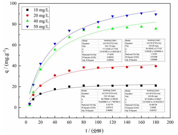 根據(jù)動力學方程,當溫度為25℃且改性活性炭用量為8g/L時,擬一級動力學和擬二級動力學分別用于擬合。發(fā)現(xiàn)二階動力學方程的擬合效果更好,結(jié)果如所示圖2。