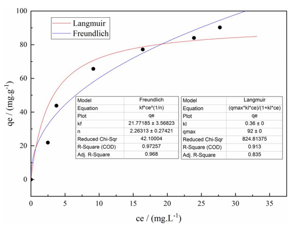 當反應溫度為25℃,投加量為8g/L時,可獲得不同初始濃度下亞硝基二乙胺的平衡濃度和改性活性炭的平衡吸附容量。使用Langmuir和Freundlich熱力學方程對數(shù)據(jù)進行擬合,結(jié)果如所示圖3從圖中可以看出,吸附過程不符合Langmuir等溫線方程,F(xiàn)reundlich吸附等溫線方程也適用。當初始濃度達到一定值時,吸附趨于平衡并達到飽和。