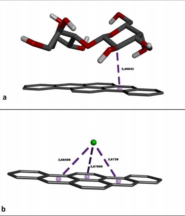 在這項(xiàng)研究中,進(jìn)行了分子對(duì)接以檢查活性炭與乳糖以及離子:鈣的原子間相互作用。如圖2a所示,乳糖分子在其結(jié)構(gòu)中的吡喃半乳糖環(huán)的第三個(gè)碳原子上與活性碳的六角碳環(huán)形成一個(gè)疏水π-σ接觸。雖然這種非鍵合接觸的長度為3.40Å,但乳糖與活性炭的結(jié)合自由能是有利的。鈣(Ca+2)離子與三個(gè)相鄰的活性炭六角碳環(huán)形成三個(gè)鍵相互作用(圖2b)。