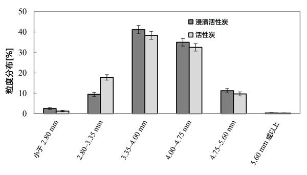在一系列實(shí)驗(yàn)中使用了用碘酸和無(wú)機(jī)酸浸漬的顆粒活性炭。根據(jù)測(cè)量粒度分布、堆積密度和甲苯吸附能力,和測(cè)量浸漬活性炭的pH值。粒度按篩子大小分類。通過(guò)測(cè)量包裝在200mL容器中的浸漬活性炭的重量來(lái)計(jì)算堆積密度。通過(guò)將1/10甲苯蒸氣流到10g浸漬活性炭中,測(cè)量甲苯蒸氣吸附前后的重量差,計(jì)算出甲苯吸附容量。將3g浸漬活性炭加入300mL離子交換水中并搖動(dòng)30分鐘,制成活性炭樣品再進(jìn)行pH測(cè)量。圖1顯示了浸漬活性炭和活性炭的粒度分布。對(duì)于浸漬活性炭和活性炭,粒徑均為2.80-5.60毫米。這些粒徑通常是氣體處理的值。通過(guò)浸漬,堆積密度增加,甲苯吸附能力降低。這可能是由于浸漬材料滲入了孔隙。由于金屬的雜質(zhì),活性炭的pH值呈堿性。由于酸解離,通過(guò)浸漬降低了pH值。