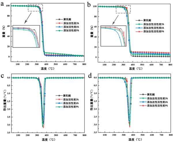 熱重分析結(jié)果列于圖3中。所有樣品均呈現(xiàn)單一熱降解階段,但5%質(zhì)量損失溫度(T5%)或熱降解速率最高溫度(Tmax)略有不同。純聚乳酸在322℃時開始快速降解,如圖3a所示,其Tmax達(dá)到363℃,并且在400℃時幾乎所有質(zhì)量都損失了。在800℃的終端溫度下測得相應(yīng)的殘?zhí)柯蕛H為1.35%。相比之下,當(dāng)應(yīng)用改性活性炭時,酸性添加劑(磷酸鹽)會促進(jìn)聚乳酸復(fù)合材料的較早分解,這與之前的結(jié)果一致。殘?zhí)柯孰S著復(fù)合材料中改性活性炭的加載而逐漸增加。純聚乳酸和改性活性炭復(fù)合材料的Tmax幾乎沒有差異,分別為363℃、364℃、357℃和363℃。因此可以看出,改性活性炭負(fù)載對聚乳酸降解沒有影響。在600℃到800℃的范圍內(nèi),聚乳酸燃燒的殘余物沒有質(zhì)量變化,但在一定程度上可以觀察到輕微的質(zhì)量損失,表明加入改性活性炭后復(fù)合材料的燃燒延遲。