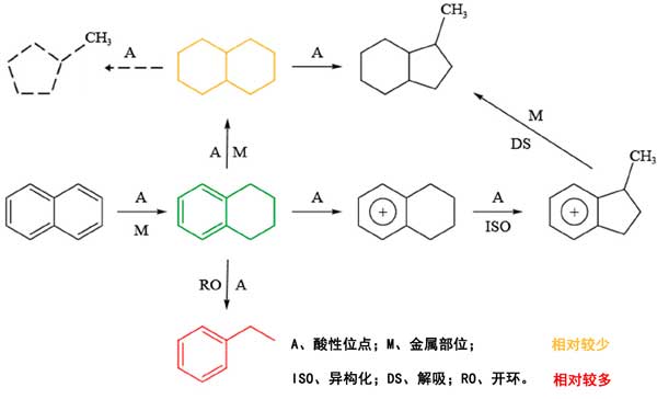 萘在改性活性炭催化劑上的加氫路徑如圖4所示。與氧化鋁催化劑上的類似,活性炭催化劑上的萘在酸性位點和MoS2的共同作用下可以生成四氫化萘和十氫化萘。四氫化萘在酸性位點與烷基苯形成碳鎓離子,然后異構化為甲基-茚碳正離子,最后在活性位點解吸成1-甲基-茚滿。同時,四氫化萘在酸性位點受到溢氫作用時,苯環的α位和γ位斷裂,生成乙苯。通過從酸性位點上的MoS2活性位點溢出氫氣,萘烷進一步加氫裂化為1-甲基-茚滿。與氧化鋁催化劑相比,活性炭催化劑產生更多的四氫化萘和更少的萘烷,這是因為活性炭催化劑比氧化鋁具有更少的酸位。