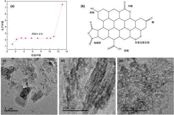 圖1:活性炭載體的研究:(a)零電荷點(diǎn)(PZC)的測(cè)定:反應(yīng)24小時(shí)后所得pH值作為起始pH值的函數(shù)。(b)不同含氧基團(tuán)。