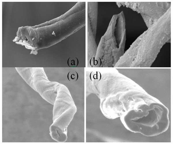 通過煅燒和HNO3、H2O2和KOH活化,廢棉纖維成功轉(zhuǎn)化為不同結(jié)構(gòu)的活性炭。圖1顯示了三種活性炭的SEM圖像。可以看出,化學(xué)活化有助于大孔隙的形成。在整個纖維長度上可以觀察到一個空心芯,直徑約為0.5–5.0µM,形狀幾乎為圓形。活性炭具有高度多孔的結(jié)構(gòu),核心直徑在大約0.5和5μM之間(圖1b,d)。這種大孔隙率可能與纖維內(nèi)壁木質(zhì)素的化學(xué)破壞有關(guān)。參考活性炭(圖1a)呈現(xiàn)大孔隙,而形態(tài)特征是纖維中芯的出現(xiàn),其直徑取決于活化劑。使用過氧化氫作為活化試劑獲得最大直徑(圖1b)。如圖1b-d所示,前體的結(jié)構(gòu)(最初具有干凈的表面)在每次化學(xué)處理后都會被破壞。有趣的是,其中一種活性炭的表面在化學(xué)活化的影響下發(fā)生明顯變化(與其他活性炭相比)。