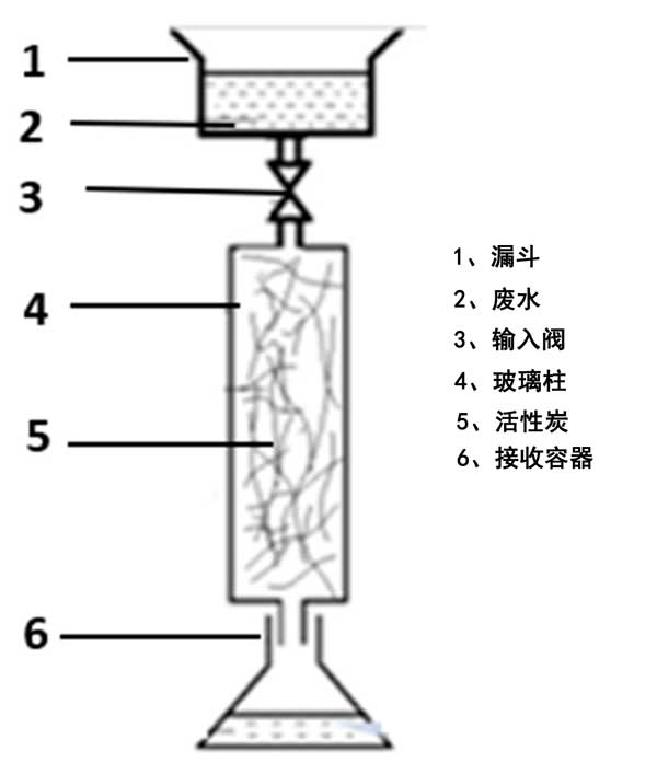 通過在密封玻璃瓶中將已知量(4.0g)的活性炭與50mL實(shí)際廢水樣品進(jìn)行反應(yīng),進(jìn)行批量吸附平衡實(shí)驗(yàn)。測試了具有不同初始硫濃度(100、300、500、800和1000mg·L-1)的五個樣品。將瓶子在恒溫?fù)u床上放置24小時(shí),直至達(dá)到平衡(最終pH值:10.5)。用于床吸附實(shí)驗(yàn)的裝置的示意圖如圖2所示。將碳化纖維填充到玻璃柱中以研究它們的吸附能力。廢水被引入漏斗并通過輸入閥以將流量調(diào)節(jié)為4–5.10m3·h-1。首先,使用流經(jīng)柱的蒸餾水潤濕床吸附裝置以改善活性炭纖維的潤濕特性。其次,允許漏斗中的煉油廠廢水樣品內(nèi)容物通過活性炭床通過重力排放到接收容器。每小時(shí)回收處理過的水。