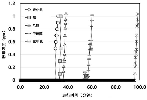 為了評估活性炭對不同廢氣的有效吸附量,應研究其吸附能力。廢氣的氣味閾值和刺激水平在十億分之一的水平。吸附劑的總吸附容量很難用作從廢物中去除廢氣的設備的設計因素。因此,我們根據突破點計算了小于1ppm的有效吸附量。突破柱實驗在304不銹鋼管式反應器中進行,總流量為1L/min,其中包含硫化氫(H2S)、氨(NH3)、乙醛(AA)、甲硫醇(MM)和三甲胺(TMA),如圖2所示。突破曲線依次為H2S、NH3、AA、MM、TMA。與廢氣相比,TMA具有更好的動態吸附性能,因為它具有更長的突破時間和相應的更大的有效吸附容量(<1ppm)。