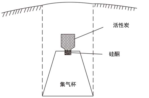 所用儀器為活性炭氡檢測(cè)儀。在現(xiàn)場(chǎng)調(diào)查中,將使用過(guò)的活性炭烘烤干燥。冷卻后,將活性炭按照適當(dāng)?shù)臉?biāo)準(zhǔn)放入取樣器中,用硅膠塞規(guī)避地下水分的影響,然后將樣品密封備用。接下來(lái),將裝滿(mǎn)的采樣器口朝下放置在測(cè)試坑中,如圖1所示。采樣器和集氣杯穩(wěn)定固定,上面蓋上塑料布,密封坑口。當(dāng)埋杯到預(yù)設(shè)時(shí)間(至少5天)時(shí),取出采樣器,仔細(xì)填寫(xiě)采樣時(shí)間和氣候。然后將采樣器放入經(jīng)過(guò)測(cè)試和校準(zhǔn)的活性炭氡氣檢測(cè)儀中,記錄每個(gè)采樣器的線(xiàn)數(shù)和點(diǎn)數(shù)。