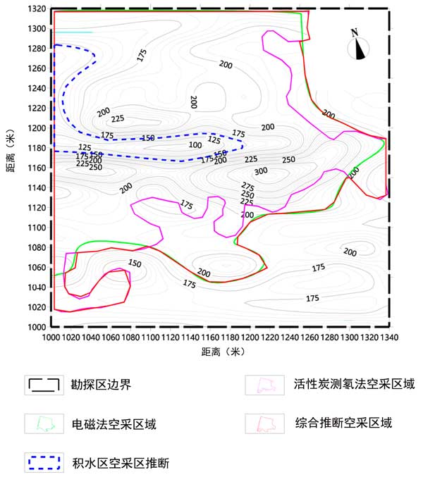 本次調(diào)查工作將電磁法與活性炭測(cè)氡法相結(jié)合,形成綜合物探方法,對(duì)某礦區(qū)地下采空區(qū)情況進(jìn)行了研究。首先,電磁法用于探測(cè)采空區(qū)的深度探測(cè)。發(fā)現(xiàn)1個(gè)低阻異常帶和1個(gè)高阻異常帶,推測(cè)后者為采空區(qū)異常帶,前者由采空區(qū)積水或大鵬地層水富集形成,推測(cè)為采空區(qū)積水異常帶。然后使用用于測(cè)氡的活性炭方法來(lái)推斷地下采空區(qū)的位置和范圍。結(jié)合電磁法勘探成果,推測(cè)該采空區(qū)為氡值異常帶。