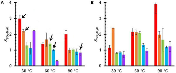 圖1:五種活性炭在濕煙氣與干煙氣混合物中吸附的SO2量。圖中顯示了T=30℃(藍色)、60℃(綠色)和90℃(紅色)實驗結果。