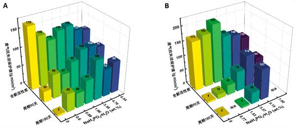 用磷酸三鈉12水合物(Na3PO4·12H2O)在活性炭上進(jìn)行類似的實(shí)驗(yàn),活性炭失活后干燥。實(shí)驗(yàn)在11.03wt.%的濃度下進(jìn)行,相當(dāng)于4.00wt.%的NaH2PO4·H2O的摩爾當(dāng)量。很明顯,磷酸三鈉在抑制衰老方面并不有效。經(jīng)過(guò)3個(gè)月的加速失活,保護(hù)值甚至低于未改性的活性炭。然而,Na3PO4·12H2的效率可能會(huì)降低如果在酸性環(huán)境中或與酸或酸性化合物一起添加,效果會(huì)更好。這是因?yàn)樗嵝詶l件可以向磷酸鹽提供質(zhì)子,導(dǎo)致磷酸鈉有效地充當(dāng)Na2HPO4或NaH2PO4。總體而言,結(jié)果表明,在由磷酸及其三種鈉鹽組成的磷酸鹽添加劑中,一元鹽NaH2PO4·H2O是抑制失活最有效的添加劑。