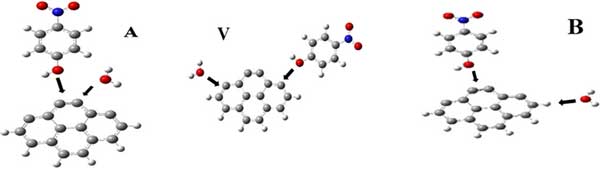 如上所述,為了啟動對復合物優化結構的系統搜索,硝基苯酚和水分子均以選定的方向放置在距活性炭表面3Å的位置,覆蓋主體周圍的整個物理空間。兩個分子被設計為從不同的相對方向相互接近:(1)兩者都從本體的同一側進行攻擊(A-初始構型),(2)攻擊來自本體的相對側(V-初始構型),(3)兩個分子遵循垂直路徑(B-初始構型)。這三種方法如圖2所示。選定的初始構型AB區分通過化學吸附或通過物理吸附連接的復雜結構的形成。配置A有利于物理吸附,而配置V和B分別有利于完全和部分化學吸附。