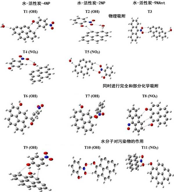 活性炭硝基有機污染物吸附中水的作用,在干燥和潮濕條件下氣相活性炭上4NP、2NP和9NAnt分子的吸附進行了分子水平的系統研究。密度泛函理論計算表明不同物質在活性炭上部不飽和側具有良好的吸附作用。濕度可以刺激吸附。水可以充當主體和吸附物之間的連接劑,但可以產生競爭,因為考慮到其極性行為,它可以直接連接到活性炭的非極性表面。