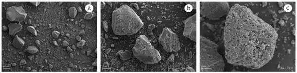 圖1:不同放大倍數下的活性炭SEM圖像:(a)100×,(b)500×,(c)1400×。