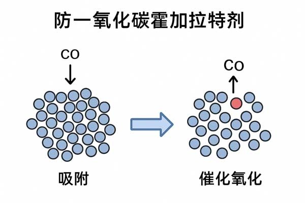 防一氧化碳霍加拉特劑的工作機制主要依靠催化反應和表面吸附相結合: