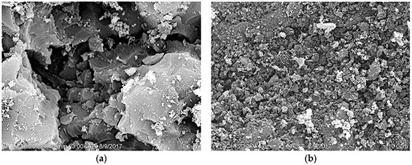 圖1:在3000×放大倍數下的SEM照片:(a)未經預處理的活性炭,(b)微波處理的活性炭。
