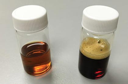 圖4.左小瓶經過活性炭過濾。右小瓶未經過活性炭其中的泡沫穩定長達4小時。