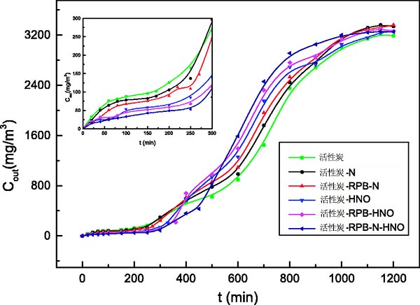 甲苯在不同活性炭上的穿透曲線和吸附等溫曲線如圖3所示和4。不同活性炭上的吸附速率從高到低依次為:活性炭-RPB-N-HNO>活性炭-RPB-HNO>活性炭-HNO>活性炭-RPB-N>活性炭-N>原始活性炭。吸附速率越大,滲透時間越長,這又與活性炭的復雜孔徑分布和表面官能團的量有關。活性炭的微孔體積在高溫氮氣中增大,這增加了活性炭通道的內部孔隙體積。在高重力氮氣環境中,不利于甲苯吸收的原始活性炭的內部結構被重新分配并分裂成新的空間構型,這進一步增加了突破時間。HNO 3處理的活性炭的突破時間在高重力環境中的改性大于具有HNO 3浸泡的改性活性炭。這是因為HNO 3分散的細小液滴中,這增加了其與活性炭的表面和內部的接觸概率,這反過來增強了活性炭上含氧官能團的負載并增加了它們的吸附效率。在重力作用下,復合改性處理的活性炭具有較長的穿透時間和較大的吸附速率,因為物理改性增加了比表面積,增大了孔體積分布,而化學改性增加了表面氧基團數。反過來,這些特性增強了吸附性能。