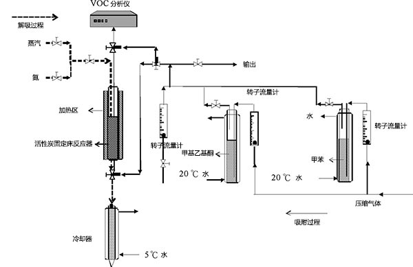 連續(xù)交流吸附解吸試驗(yàn)的實(shí)驗(yàn)裝置如圖1所示。活性炭固定床反應(yīng)器的直徑為2.72厘米,長(zhǎng)度為30厘米。吸附條件是空氣中MEK=4000ppm,氣體速度=0.3米/秒,吸附溫度30℃,相對(duì)濕度(RH)<10%。將活性炭在烘箱(140-150℃,4小時(shí))中烘烤后,將其取出并置于干燥盤中冷卻。稱量所需的活性炭并置于固定床反應(yīng)器中進(jìn)行吸附試驗(yàn)。將恒定流速的壓縮空氣注入含有有機(jī)溶劑(MEK或甲苯)的氣泡瓶(保持在20℃)中。通過(guò)調(diào)節(jié)轉(zhuǎn)子流量計(jì)來(lái)控制單一(4000ppm MEK或4000ppm甲苯)或二元(2000ppm MEK+2000ppm甲苯)蒸氣的濃度。然后將氣體引入反應(yīng)器中進(jìn)行實(shí)驗(yàn)測(cè)試(保持在30℃)。繼續(xù)進(jìn)行實(shí)驗(yàn)測(cè)試直至吸附劑達(dá)到飽和,其定義為出口VOC濃度達(dá)到入口濃度的95%的時(shí)間。使用VOC分析儀測(cè)量氣流中的蒸氣濃度。然后將活性炭從反應(yīng)器中取出并稱重用于計(jì)算飽和MEK吸附容量。