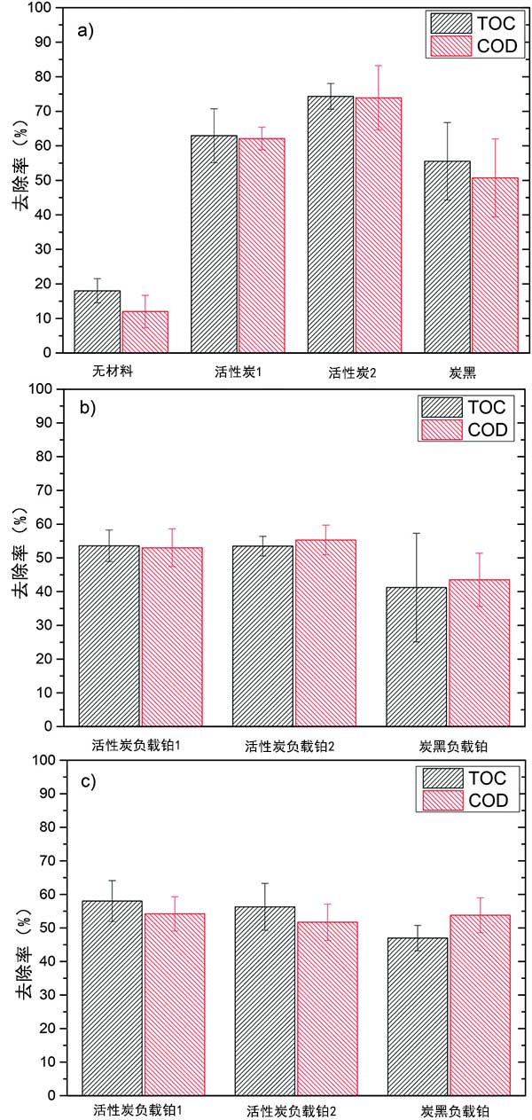 因此,在裸載體和催化劑的實驗中,TOC和COD去除的主要差異主要歸因于在碳載體上的吸附。用催化劑去除TOC和COD的較低可以通過伴隨Pt浸漬的比表面積的減少來解釋。