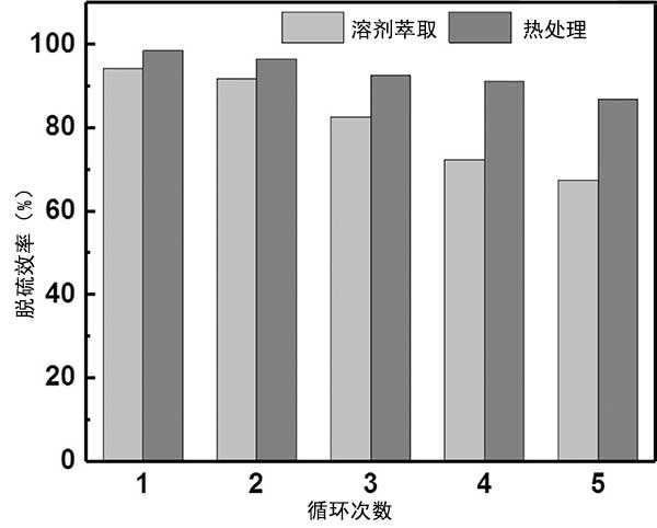 在吸附脫硫中使用的各種方法中,溶劑萃取和熱處理被認(rèn)為是常用的再生方法。在這項(xiàng)實(shí)驗(yàn)中,溶劑萃取和熱處理都用于研究活性炭的再生性能。關(guān)于溶劑萃取方法,在第一次吸附循環(huán)完成后,通過外部磁體收集活性炭,并通過添加甲醇作為萃取溶劑進(jìn)行洗滌。然后,將活性炭干燥用于下一次運(yùn)行。如在示出的圖3,它被發(fā)現(xiàn)的活性炭可在前兩次運(yùn)行時(shí)通過溶劑洗滌輕松再生。這可能是因?yàn)槲锢砦皆谖竭^程中占主導(dǎo)地位,并且由污染引起的大多數(shù)失活吸附劑可以通過溶劑萃取方法在初始循環(huán)中再生。然而,在連續(xù)五次再生操作后,吸附劑與新鮮吸附劑保持67%的初始脫硫效率(相當(dāng)于20.22mg DBT/g)。隨著循環(huán)次數(shù)的增加,活性更高的位點(diǎn)與DBT相互作用,并且后一次運(yùn)行留下的活性位點(diǎn)更少,從而導(dǎo)致隨后的再生運(yùn)行中脫硫效率降低。為了提高活性炭吸附劑的再生效果,引入了熱處理方法。通過溶劑萃取再生后,將獲得的活性炭在氮?dú)夥障略?50℃下活化1小時(shí)來恢復(fù)活性。