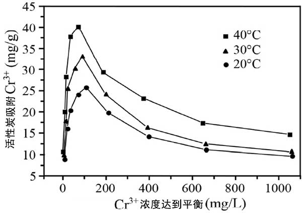 2、已經(jīng)確定,活性炭在20、30和40℃下的鉻吸附等溫線具有取決于平衡濃度的不規(guī)則形狀。三條曲線顯示出類似的趨勢(shì),陽(yáng)離子攝取量的初始增加非常快。達(dá)到最大值后,隨著平衡溶液中鞣劑含量的增加,它們明顯降低。