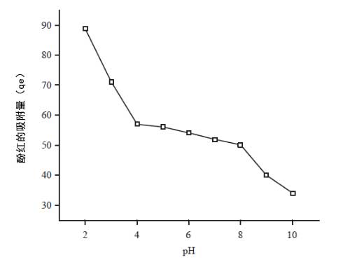 pH對吸附的影響:由于氫和氫氧根離子通常在活性炭表面上非常強烈地吸附,因此其他離子的吸附也受到溶液pH的影響。pH也影響染料的離子化程度以及吸附劑的表面性質。作為pH的函數的活性炭中酚紅染料的百分比吸附的圖示于圖4中。觀察到(a)染料的吸附在2至4的范圍內迅速降低。(b)在4-8的pH范圍內吸附的減少變慢,和(c)在pH8-10的吸附下急劇下降。在研究的活性炭上染料吸附的這種獨特的pH依賴性變化可能是由于吸附物的復雜性質以及吸附劑在不同介質pH下的凈電荷變化。