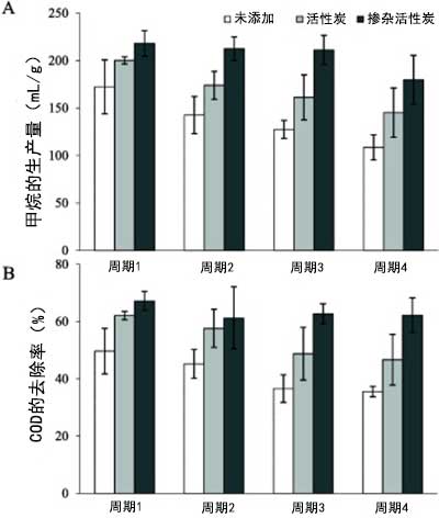 近期使用活性炭作為促進電活性微生物組以增強厭氧消化性能的添加劑已被廣泛研究。該研究發現摻雜磁鐵礦的活性炭顆粒可以顯著改善丙酸鹽的互變性降解,丙酸鹽是在厭氧消化過程中不易被微生物群落降解的底物。用磁鐵礦摻雜的活性炭修正的生物反應器在補料分批試驗中實現了高甲烷產量和COD去除率,分別是對照和活性炭處理的生物反應器的1.5和1.2倍。發現乙酸鹽積累與甲烷產生相關。微生物群落的定量比較表明,與對照相比,添加活性炭或摻雜鐵的活性炭沒有獲得更高的微生物生物量。