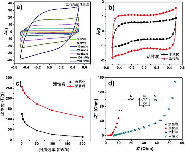 在不同掃描速率下觀察到兩種活性炭的準矩形CV曲線(圖3a),這暗示了非理想的電容行為。我們還觀察到活化后的活性炭的CV環路較大,這意味著它具有比未活化的活性炭更大的電容(圖3b)。具體電容的總結如圖3c所示,活化后活性炭獲得的高電容為270,而沒活化的活性炭為125。這種高電容可歸因于諸如高表面積,分級孔徑分布和活性炭的表面潤濕性等因素。對于兩種活性炭,由于電解質不足以擴散到電極材料的內孔中而觀察到對應于掃描速率增加的比電容的降低。