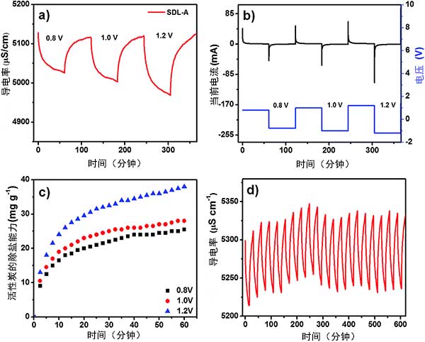 在充電步驟期間,在兩個電極上向膜電容去離子施加正電勢,以從已知NaCl濃度的溶液中吸附離子,并施加負電位以使電極放電并排出廢物流中的離子。圖4a顯示了在NaCl溶液中0.8V至1.2V的各種電位下,活性炭在初始濃度2500mg L-1下的脫鹽性能。在所有施加的電位中,在充電期間首先觀察到溶液電導率的急劇下降,并且當吸附接近平衡時,電導率的變化減小直至達到平臺。圖4b示出了具有增加電勢的正相關電流瞬變,而圖4c顯示了活性炭電極在不同施加電位下的鹽吸附容量。從0.8V到1.2V,鹽吸附容量從23增加到38mg g-1,表明更高的電池電位可以提高電吸附能力。觀察到的現象可歸因于強靜電力的存在以及在增加的電壓下形成較厚的雙電層。圖4d示出了活性炭電極的循環穩定性,在2500mg L-1的NaCl溶液超過20次充放電循環而沒有去除能力任何明顯的損失。該結果證實了使用活性炭當電極可以再生和重復使用而沒有任何損耗,活性炭是成為用于膜電容去離子應用的電極材料的好材料。