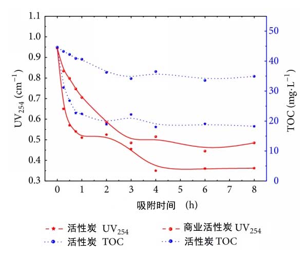 根據圖4,活性炭表現出良好的吸附生化水的性質。UV254和TOC的濃度具有類似的變化趨勢。UV254和TOC的去除效率分別為63.0%和59.7%。商業活性炭的吸附性能較弱。UV254和TOC的去除率僅為52.9%和24.8%。商業活性炭的孔體積小于活性炭的孔體積。圖4中活性炭的UV254去除曲線分為兩個階段,它們分別對應于膜擴散和粒子擴散。