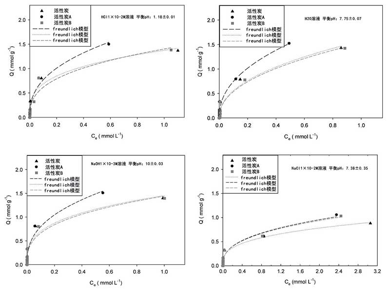 從圖3可以看出,在所有測試的實驗條件下,當平衡濃度較低(即<0.1mmol L-1)時,對羥基苯甲酸甲酯吸附量的差異三種活性炭最小,而對于較高的平衡濃度,活性炭A表現出最高的性能,活性炭和活性炭B具有相似的行為,除非離子強度發生變化。事實上,在后一種情況下,熱處理樣品顯示出最佳性能并且幾乎相似。為了詳細分析檢索到的結果,需要進一步調查,建模分析可能會有所幫助。