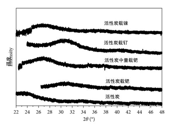 活性炭載三種金屬的衍射圖如圖2所示。在該圖中,可以看出金屬樣品或活性炭沒有確定的信號,這可能表明所有樣品中都沒有結(jié)晶相,或晶體非常小(<100)。不存在結(jié)晶是由于樣品的低金屬負(fù)載量低于X射線衍射設(shè)備的檢測極限的結(jié)果。