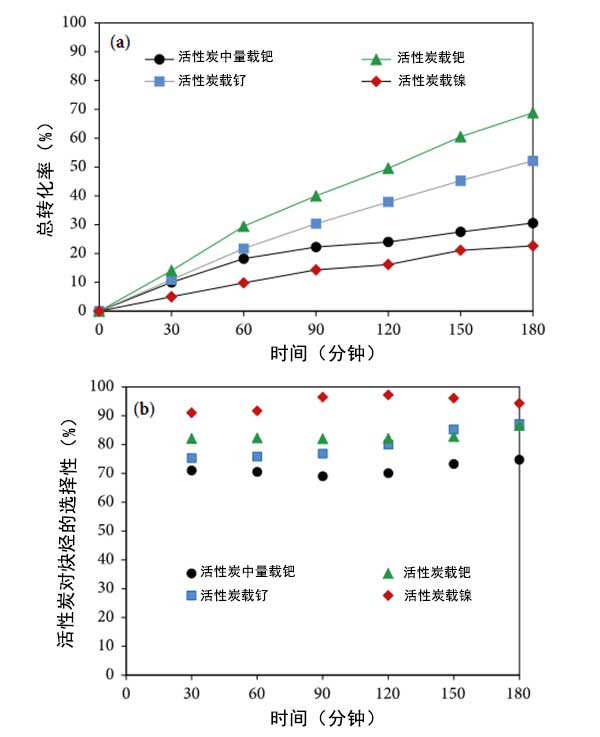 圖3:在120℃的氫中預(yù)處理的幾種活性炭催化劑的總轉(zhuǎn)化率(a)和炔烴(b)對時(shí)間的選擇性。