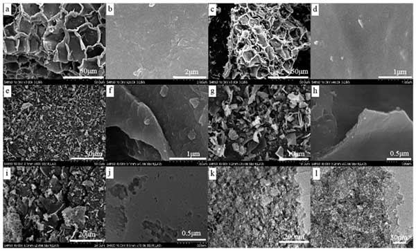 通過SEM和TEM研究了空氣氧化前后活性炭的微觀結構(圖2)。在(圖2a,b)中,軟木材料呈蜂窩狀結構并具有明顯的褶皺。在800℃碳化后,保留結構并且包含該結構的部分彼此緊密結合,看起來光滑(圖2c,d)。在350℃-450℃下空氣活化后,結構單元被分離形成薄片(圖2e),這可歸因于細胞之間木質素的降解。活性炭呈現出層狀空氣氧化后的結構(圖2的e-j)的。350℃和400℃活化的活性炭樣品表面相對光滑,在0.5-1μm的分辨率下未觀察到明顯的孔結構(圖2f,h)。當氧化溫度升至450℃時,活性炭的表面顯著變化并觀察到大量的孔。圖2j顯示450℃活化樣品顯示出具有裂縫和空隙的粗糙表面。TEM結果(圖2k,i)顯示450℃活化的活性炭具有三維(3D)互連框架的分級微/中孔結構。這些孔可以有助于廢水中染料的吸附。