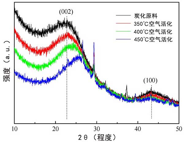 圖3顯示了空氣氧化之前和之后活性炭的XRD圖譜。所有樣品在~24°處顯示典型的寬峰,在~43°處顯示弱峰,分別對應于石墨碳的(002)和(100)平面。所有樣品的寬峰和弱峰反映了活性炭的低度石墨化。與炭化原材料相比,隨著氧化溫度的升高,(002)峰逐漸向較高角度移動。該運動表明空氣氧化后石墨結構中(002)晶面的d-空間減小。結果表明,活性炭的空氣活化導致石墨結構具有改善的致密性。